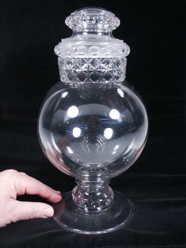 This glass vase stands 11 3/4" high with ornate edging. The magician demonstrates the emptiness of the vase and places on the lid followed by covering with a silk (not supplied). A paper is caught fire and waved toward the vase sending the smoke in its direction. Snuffing out the fire on the paper the magician walks over to the vase pulling the silk away and the vase is seen to be full of smoke! The lid removed and blowing across the mouth causes the smoke to flow outward! Another effect would be to cover the vase with a silk and puffing on a pipe or cigarette or cigar blowing the smoke toward the vase to cause the same effect. Includes instructions. The two liquid ingredients to cause this reaction are not included but easily obtainable. Condition minor chipping at top edge of vase mouth otherwise very fine.