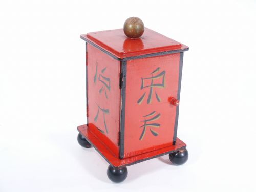This cabinet of wood stands 8 1/4" high having two doors, one at front and one at rear both hinged to the same side panel of cabinet. First shown empty and then closed and on opening again a glass by itself or filled has made its appearance and may be removed from the cabinet! Condition very good.