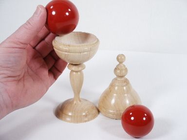 Of all the various Pill Boxes I have had the occasion to handle and work with this is the finest. Made of pure hard maple this vase stands 7 3/4 inches high with the ball size being a 1 3/4 inch diameter. For a Pill Box to work properly all the surfaces have to be perfectly mated which this is in the precision turning. This vase also has a brass set pin to keep the lower half shell in registration so the top half shell which is locked into the top half of the vase by merely a friction fit will join perfectly once the spring loaded finial top is depressed. It is in this way that the performer may remove the solid ball from the vase and cause its disappearance and upon returning to the the vase and removing the lid a complete ball is taken from the vase. This is an effect that any familiar with the standard Ball and Vase Trick will be left scratching their head upon seeing this performed. The style of this vase is like none other and one to be appreciated for its small body size in appearance for maximum deception. The finish of the wood is silky smooth showing the extra care by a master and his finished product. A vase of this type takes many days of a mans life to complete. | |