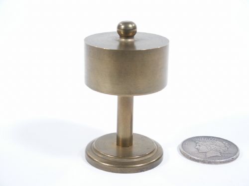 I have never seen this before and it likely was custom made. This is precision made of brass and stands 3 1/4" high having a diameter of 1 15/16". The exact purpose is not known but a description of the make up follows. The cover has an inner sleeve that looks like the platform of the unit that perfectly sleeves over the platform top. The base has a hollow platform top that has a friction fit disk that appears as the top surface that will sink into the platform top allowing inner sleeve from cover to become new surface. This allows for a possible change of item placed on platform. Coin not supplied. Condition First Rate.