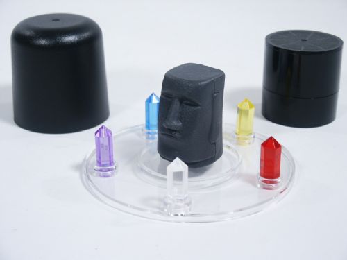 Explaining the mysteries of the famed Easter Island statues, a small replica of a mythic idol is placed on a clear stand, surrounded by various colored gemstones. A spectator points to one of the stones. Under cover of dark, the stature mysteriously turns to face the chosen stone. This may be repeated. The spectator can place the jewels in the stand and cover the statue, the magician never touches the stand, the gemstones, the cover or the statue and yet, the idol always knows where to look! Easy to do and a great magic trick. Includes illustrated instructions. Condition First Rate.