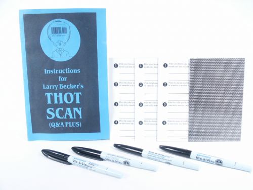 Larry Becker's Thot-Scan is a question and answer plus that includes 4 personality profile cards that measure 3 1/2" x 5 1/2" and laminated in clear plastic to prevent soiling. Also included are 4 wet erase markers. The booklet is 14 pages in length and as all Becker items is practical in working. Condition unused like new.
