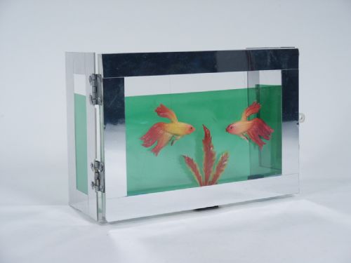This aquarium is beautiful with dimensional fish and measures 5 1/2" high x 8" wide x 3 1/4" deep and after being shown is caused to vanish in an instant! Includes 3 pages of photo illustrated instructions and made in a limited quantity from many years ago. You will also need a 4 foot length of 1/4" nylon cord to go along with this. Condition very fine, never used.