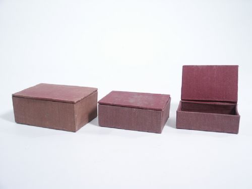 The ad states "Your audience will never guess how the marked coin gets into the innermost box!" Based on the magic coin box principle, you have three fabric covered boxes, the largest measuring 3 7/8" wide x 1 5/8" high x 2 3/4" deep and the smallest measuring 3 1/8" wide x 1 1/8" high x 2 1/8" deep. This includes a much later metal coin slide but not the original. Condition early and good.