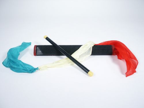 A semi transparent net tube measuring 11 1/4" in length is shown and three different color silks are knotted and pushed in with wand. In full view at all time through the tube the silks change into a three color flower growth! Includes illustrated instructions and from Tricks in Japan. Condition very fine.