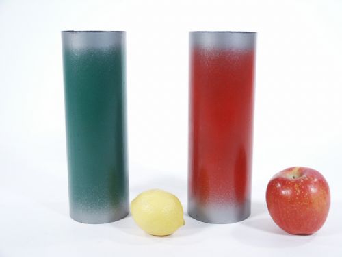 Metal tubes are 9" in height and nest together for compact carry and are in red and green painted much like P&L did for their bottle tubes. The effect is of an apple that passes from one tube to the other with much clever patter and eventually when the audience feels they are wise to what is going on the magician surprises them with a lemon instead of the expected second apple. In order for this effect to be performed you will need a black art well table and fruit. Includes instructions with funny patter. Condition very fine.