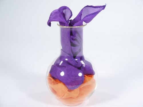 The glass bottle is 5" in height and with this you will fool yourself if you try this in front of a mirror as the impossible happens. After showing the glass bottle, the orange silk is tucked in where it reaches the rounded portion. After this the deep purple silk is placed in completely blocking the orange silk as it is fully in the neck of the bottle. With one hand holding the bottle and the other making a pulling motion toward the solid bottom, the orange silk suddenly is seen to be pulled through the bottom! The visuals are impressive with this. Silks supplied as seen in picture. Includes instructions. Condition very fine.