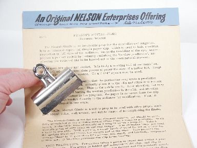 From Nelson Enterprises this appears as a simple Boston Clip for holding papers together and it is used to hold a written prediction in full view of the audience yet in the twinkling of an eye it accomplishes a perfect switch by instantly vanishing the in view prediction and allowing the switched one to be handed out in the most natural manner. Includes the original 8 pages of routining and patter presentations with the additional ideas of Syd Bergson. | |