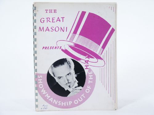 | Published by Supreme Magic, comb bound, 50 pages, photos and illustrations. Index of Photographs and Illustrations: The Great Masoni Master Magician, Reproduction of Press Advertisements, Masoni and Shan at the Edinburgh Festival, Masoni during his tour of India, On board R.M.S. Queen Elizabeth, The Ballet of the Floating Ball and more. Chapters: What Is Showmanship?, Can Showmanship Be Taught?, The Essential Points Of Good Showmanship, Production, Rehearsal, Acting, Patter, Style, Timing, Tempo, Make-Up, Publicity, It's Not What You Do...., Conclusion. Condition private collection identifier number, fine. | |