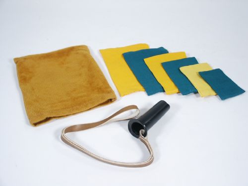 Seven bags in all along with leather loop to tube gimmick for introducing article to innermost bag. This includes 4 pages of German language instructions but if you have any background in magic you would understand the working. Condition very fine.