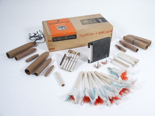 You will find Diminishing Cigar, Single Cigarette Producers, Cigarettes with Feather Flowers and 2 Producers, one which is gravity fed with small holes across top edge used to sew into coat and other is change over gimmick with clips on both sides to show hands empty one at a time. All in wood Cigar Box from the Netherlands. Condition good.
