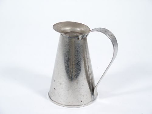 Pitcher of metal stands 4 1/4" high and will hold a good amount of liquid that you have control over how much pours out at a time. This is similar to the Merv Taylor issue in the United States. Condition minor corrosion to main body of pitcher with more around top of handle and inner lip, otherwise fine.