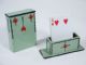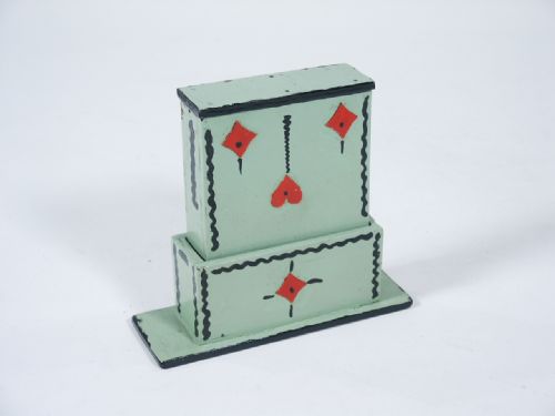 Made of wood and decorated with card pips of Diamonds and Hearts. The base is separate from the taller piece that sets down into it and will hold a little over half a deck of cards for whatever routine was intended. The bottom has 4 Hearts across which could be used as a cue to a spectator. No cards supplied and certainly a unique item. Condition fine.