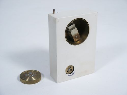 Many years ago you could find an ad in Harry Stanley Unique Magic Catalog that began with the statement "For the Chap who wants the very best and doesn't mind paying for it, Unique Coins In Glass". It went on to say this is probably the finest ever example of magical craftsmanship. This mechanism you see is highly crafted and made to fit within a cigarette case and is for the purpose of having four coins drop one at a time into a glass. The Craftsman responsible for the particular item was George Hammerton and in the style of Jon Martin. At the time this sold for a whopping $55.00, a fortune at that time. This one in beautiful condition and it needs to have internal thread replaced which is not a difficult thing to do.