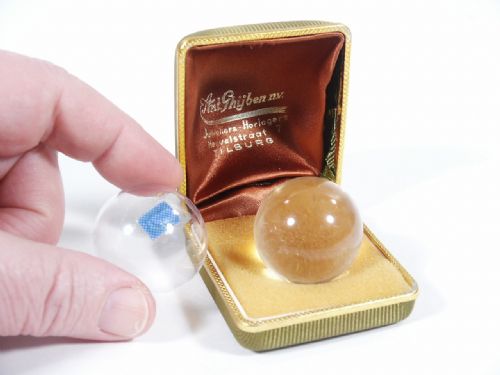 This crystal ball is examined by spectator after which a card is selected. The spectator is asked to gaze into the ball as the magician holds it close. The spectator is then shocked to see an image of the card appear in the previously examined crystal ball! This was an advancement on the original Ireland's effect. Condition very fine.