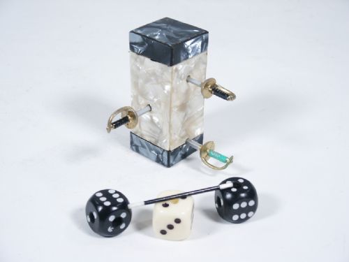 Three effects are given in the two pages of instructions 1. Where a die penetrates another die and a magic wand 2. Two dice change places 3. White die penetrates a black die even with all dice locked with swords! This early effect stands 2 3/4" high and made of wood with Mother of Pearl type laminate. Condition very fine.