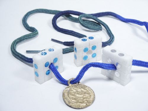 Another nicely made item from a Dutch Craftsman which includes blocks of plex that are designed with kerfs and each having an opening at center to allow for passage of cord included. The blocks are 1 1/4" in size with a thickness of 3/8". Also includes a Medal which likely was used as a penetration in possible routine. Two blocks are ungimmicked and the third is made like the Brema Nut Release. No instructions. Condition very fine.