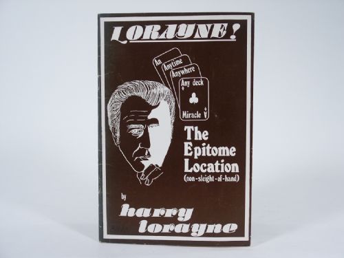 | Published by Harry Lorayne, Inc. Lorayne! The Epitome Location (non-sleight-of-hand. 1976, soft cover, 32 pages. Contents: The Epitome Location, Basic Principle, Reasoning And Logic, Calculations, Endings, Presentations, Stalemate, Poker Face, Twice As Fast, Another Way, Completely Impromptu Half At A Time, Triple Mate, Afterthoughts. Condition private collection identifier number, very fine. | |