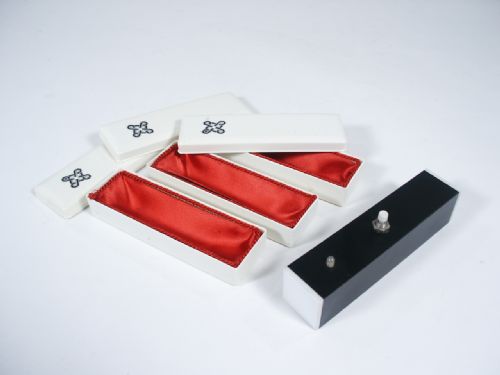 Rarely do you see items by the late Theo Timmerman and this one an early electronics wonder, one of the first of its kind produced. Three cases are shown and opened giving a view to the red satin lining within. Each case measures 5" long x 1 5/8" deep x 1" high and made to receive an article of gold in one, an article of silver in another and an item of worthless value in another. The cases are shuffled about and the magician brings out a metal detector which when placed on the top of a case just below the design and in a parallel fashion the button is pushed and the light will light green for one metal, red for another and no light at all for the case with no value! The metal detector is made of metal with plex ends and makes use of a 9 volt battery. Includes instructions in Dutch language along with English language translation. Condition very fine.