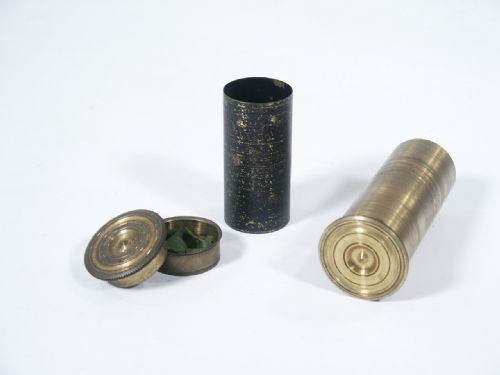 This fine all Brass piece has had a lot of quality work built in having machined closing caps that have nice style with reeded edges. The case is 2 3/4" with a 1" diameter and for the purpose of vanish of a handkerchief. For the Collector of Brass items this is a little gem. The is the Scarce smaller version. Condition very fine.