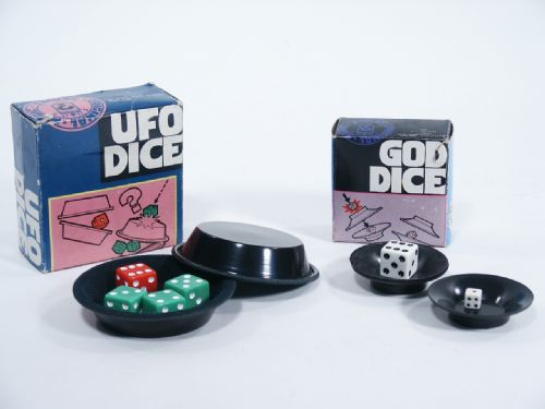 God Dice effect: performer shows two miniature flying saucers and removes a small die which is placed in his coat pocket. The small die is found back between the two saucers! Once again the small die is put into the coat pocket and it returns between the two saucers however, this time the die has grown for a surprise ending. Includes illustrated instructions. Condition very fine.