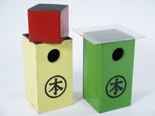 The 4 1/2" square plexiglas is placed between the two chimneys stacked one atop the other. The red wood block is dropped in the top chimney and it magically passes through the center plex falling out the bottom of the lower chimney.