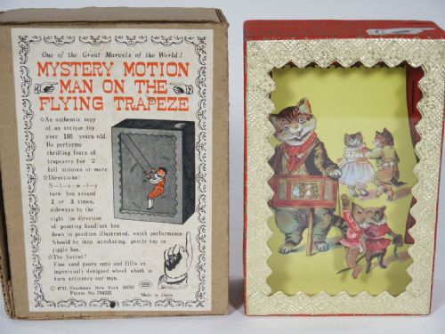 This is an exact replica of the antique original. Likely from the 60's and made by Shackman. In this unit you slowly rotate in the direction of the hand image on top several times slowly which loads fine sand into a special wheel within and once loaded you set down and watch the acrobat mouse turn and go through motions hanging from a bar for entertainment that lasts a minute or two. This is a replica done many years ago put out by Shackman N.Y. and made in Japan. Measures 7" x 4 1/2" x 2 1/8". The box this was found within is for the Man On The Flying Trapeze and is included. Condition very fine and works well.
