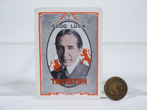 The card is of Howard on one side and Jane his daughter on the other and in First Rate condition. The 1928 Token Obverse: Bust of Thurston with Thurston The Magician 1928. Reverse: Eagle and Shield Good Luck Charm never fails 1928. 25 mm Bronze. Condition some soil, otherwise very fine.