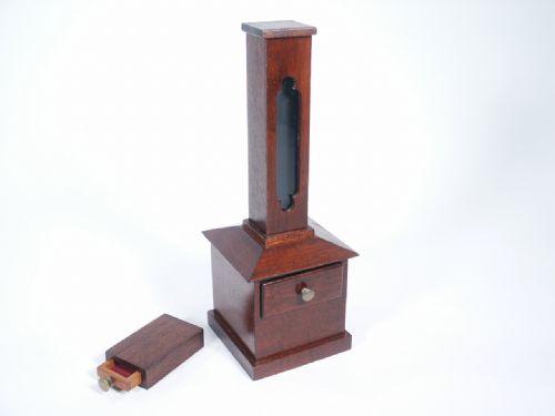 Made by Douglas-Wayne Illusioneering and part of the Hoffmann Series. This handsome mahogany wood cabinet stands 11” high having a single drawer cabinet at the base and a chimney with clear glass front at the top. Also shown is a small drawer box, made of mahogany wood.