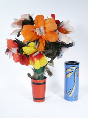After showing a metal pot that stands 5 1/2" high along with an empty decorated tube that is 3 1/2" in diameter and 9 1/4" high a production of a flower growth is made. Silk production may also be made prior to flowers if desired (silks not included). Includes instructions. Condition this is used with dents, paint absence and the flowers should be 12 instead of 10 that it has but the springs are present for the 2 missing blooms. Auctioned in as is condition.