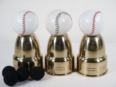 These Golden Cups have an unusual design like none other standing 3 3/16 inches high with a mouth diameter of 2 7/8 inches. Includes 4 Black Crochet Balls additionally 3 Final Load Balls that are Leather Baseballs. This is a striking set and in very fine condition. | |