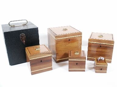 This is a beautiful 5 Box Nest made of walnut and includes the original hard case for storage and travel. The largest box is 5 1/2 inches down to the smallest of the nest measuring 1 7/8 inches. In this method the two smallest boxes have sliding trap lids and the third box of the nest is bottomless. Includes 5 pages of National Magic Company instructions for the Wonderful Nest of Boxes (No Assistant Method) also with the One Assistant Method and an additional effect. The smallest box of the nest is absent the ring pull and the pin hole it occupied has been filled as the previous owner felt it hampered operation of the nest. All boxes have piano hinges for the lids. One key operates all the locks. This is an excellent and very hard to find set you are not likely again to see. | |