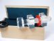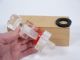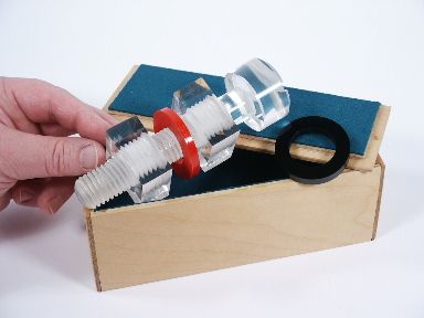 The invention of Finn Hauger of Oslo Norway considered one of the finest close up effects in small form and this one beautifully made by Anverdi of clear Plexiglas large enough to be seen and followed when performing before large groups. A box is shown empty to the audience and the bolt which measures nearly 5 1/2 inches in length is dropped into the box followed by placing on the lid and handing it to a spectator to hold. The nut which has been in full view on the table is vanished either by sleight of hand or a Devil's Handkerchief (not included). When the spectator opens the box it is found that the nut seen moments before is screwed onto the bolt! In another effect a colored plastic ring is shown on the bolt between two nuts and everything is dropped into the box. As the magician comes forward to hand the box to a spectator he lifts the ring out of the box and apparently it has penetrated the bolt! The spectator takes the box in hand and finds the two nuts still firmly screwed onto the bolt! This is really a fine piece of magic and includes the original wood box as supplied by the late Anverdi. Includes 4 pages of instructions with clear illustrations for handling. It is a marvel that Anverdi could have done such a beautiful job with this custom manufacture. Includes 2 different colored rings along with the bolt and the 2 clear nuts. In beautiful condition. | |