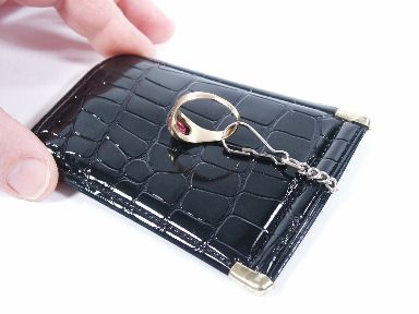 The magician hands a key case to a spectator to look over and examine and it is found to be nothing more than an empty key case with the exception of a single chain. The magician borrows a finger ring and causes it to vanish and immediately the ring is found hanging from the chain inside the very key case that the spectator has been holding! This one is easy and any magician worth his salt will love the method. Includes 2 pages of illustrated instructions. Ring pictured not included. Circa 1982. Condition very fine. | |
