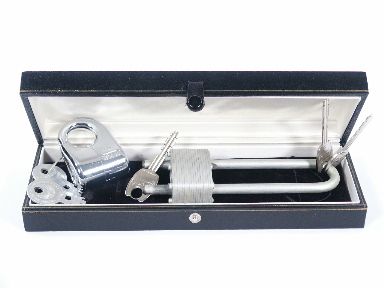 The Himber ad stated "A heckler was bothering us so we called him up on the stage and asked him to help us with an experiment. We showed him a padlock and a key. We showed him the lock opened and then we told him that in as much as we only have one key we will put the key on the lock for safe keeping. Then we handed him the lock and asked him to open it. He thought we were crazy. He protested How can you open the lock if the key is locked on the lock? We then pulled the key off the hasp to show him it could be done and then told him we don't want to lose the key so we'll put it back on the lock without opening the hasp! He tried to pull the key off but couldn't and the audience was howling at this time. He couldn't get the key off so we pulled it off again and again we placed it on the lock without opening the hasp. The heckler was furious! But the audience was laughing riotously and then came the startling climax where even the heckler had to laugh at his own expense. Yes it's a laugh riot and we hope you are one of the lucky ones to purchase this trick!"
