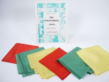 A classic effect of silk magic using 24 inch silks being two sets of three. Each set has a red a yellow and a green silk. After showing the silks one set is knotted together and placed aside. At the magician's command the knots pass from the one set to the other defying explanation. All silks are new and includes instructions and the book by Lewis Ganson 1977. Numbers 16 pages with 32 photos on the Sympathetic Silks. Book in very fine condition. Over 20 years ago this sold for over $60.00. | |