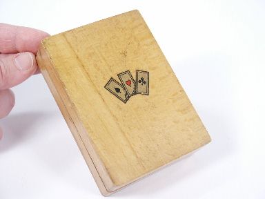 Circa 1920 Box with card design on one side and reverse side the design has worn away. Very minor movement of wood with age evident at opening edge of box. Condition good. | |