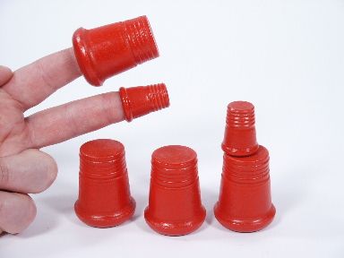 A wood thimble appears on the finger and is removed and placed in the pocket. This continues two more times and when the audience expects another thimble to appear a jumbo size thimble makes its appearance! The additional part of Thimble Jumbo ends with the production of 4 Jumbo Thimbles. Includes illustrated instructions. The thimbles are of turned wood to Mr. Berland's specifications and all in very fine condition. | |