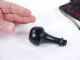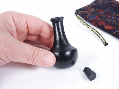 Produced a number of years ago by Britt & Associates. This is the Imp Bottle effect turned of wood and finished in ebony that the magician may lay down upon the table and it remain in this position yet when the spectator attempts to do the same the bottle will bob right back to its upright position. The mechanism is different than the standard Imp Bottle. Includes drawstring carry bag and instructions with several suggestions on ideas for presentation and use. A minor nick occurs on the edge of the main body of the jug. Condition very fine. | |