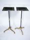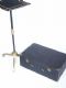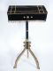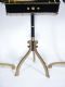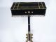 The pair of Junior side stand tables stand 33 3/4 inches high with 13 inch tops. The Colonio Table stands 33 1/4 inches high with a 13 inch x 18 1/2 inch top having a Billiard Ball well with opening to accommodate 1 1/2 inch balls. The well has a slight ramp and is 8 inches long. The Drape is of Silk Velvet and the fringe is Gold Bullion. Aside from paint absence due to rubbing in transit this set in very fine condition and includes the Wood Carry Case from Thayer. This set of tables is Thayer Quality throughout. | |