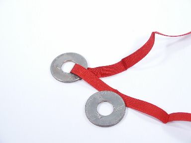 A half dollar with a hole is threaded on a ribbon with ends held by a spectator and under the cover of a handkerchief (not included) the coin is removed from the ribbon! A well made set with 1976 Bicentennial Half Dollars and includes instructions. Condition very fine. | |