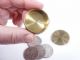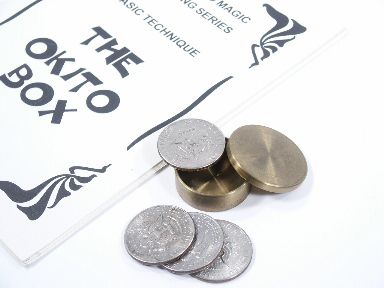 This is a well made Okito Coin Box of brass with smooth rounded edges to facilitate easier handling of box moves. The box holds 4 half dollar size coins and is trademark stamped. Included with this is the Repro Magic Teaching Series soft cover numbers 30 pages with illustrations of moves hints and routines. Coins not supplied. Condition very good. | |