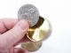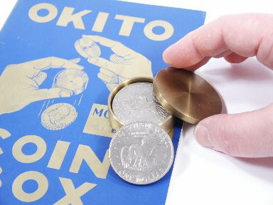 Not often seen is an Okito Box for Dollar size coins and this one is finely made by Jim Zee with rounded smooth edges making it a pleasure to handle. This holds 4 Dollar size coins (not included) and is made of brass and trademark stamped. Also included is the book by S. Leo Horowitz on Routines with The Okito Coin Box that is soft cover numbers 53 pages with photo illustrations along with drawings. Condition very good. | |