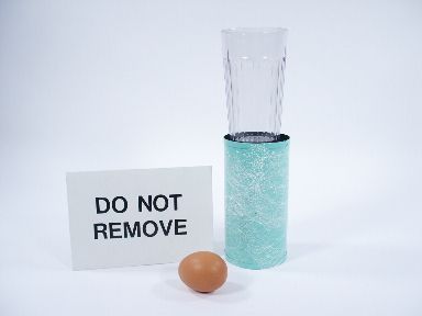 An egg is cracked into a can and a card is placed over mouth of can and all inverted and placed atop a young volunteers head. Forgetting what is to happen next the magician removes the card for the instructions and shows to audience and it states "Do not remove"!