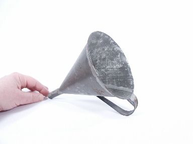 A rather large funnel made of tin and water tight to actually function. Air hole valve at top of handle where thumb of hand would naturally fall upon so as to control the flow of liquid as desired. Light surface rust near join and handle that could most likely be removed. A piece like this from this period is a scarcity. Condition very good. | |
