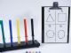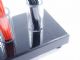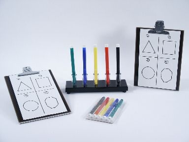 A spectator is given a clipboard with a plain piece of paper on it and a stand with 5 different colored pens. The magician takes another clipboard with a plain piece of paper on it and another 5 different colored pens. The spectator is asked to draw a circle a square etc. and divide it into several parts. The magician draws the same circle or square etc. and divides it into the same number of spaces. The spectator is then asked by the magician to color the different spaces with the different colored pens and the magician does the same all without being able to see what the spectator is doing. When all is completed the magician takes the spectators easel and shows the audience that both pieces of paper match! This beautiful effect rendered as only Anverdi could is made in plex with 2 clipboards along with the stand for holding the spectators pens and all new fresh pens for this incomprehensible effect. The stand has a hair line fracture at the base of one of the clear plex tubes for holding a pen that at a short distance is not noticeable as it is in the black plex and not affecting the performance. The clipboards are masterfully made and not just flat pieces of plex but rather cut formed and assembled. Includes 3 pages of illustrated instructions. Condition very fine. A scarce Anverdi built item. | |
