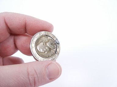 A nickel held in the fingertips changes into a silver half dollar which is then caused to vanish. A clever mechanical coin crafted by Conrad Haden that is also hooked for a vanish so the spectators will not have a chance to examine the coin. Includes extra fresh bands so you may actually perform this effect. No instructions. A scarce item in very fine condition. | |