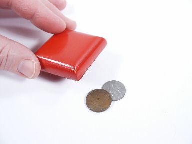 After a wheat penny is placed on the back of a spectators hand it is covered with this block for a moment and when lifted it is seen to have changed to a dime! Includes the penny and dime and instructions. | |