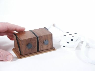 This micro magic Die Box works on a principle unlike most Die Boxes you have seen. Sitting near by the magician has a small basket or perhaps paper sack. The magician takes a piece of rope and lowers it into the bag or basket leaving a few inches hanging outside in full view. The little Die Box which measures 4 inches wide x 2 1/8 inches deep x 1 7/8 inches high is shown and the 1 3/8 inches Die is placed within. Going through the motions of tipping the box down on one end and then the other always showing the high end empty as if the Die has vanished the sucker routine is played out. Finally both doors are lifted up showing the Die has vanished and the box is set aside. Reaching over to the piece of rope that has been seen hanging a few inches outside of the basket or bag he takes hold of it and lifts it straight up and there tied to the end of the rope is the previously vanished Die! This is a signed piece by Clarence Miller. | |