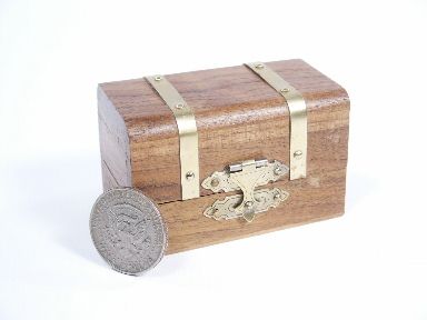 The magician asks the spectator to take a coin (this is made for use with any half dollar size coin) and place it into any one of the three available positions in this chest and close the lid followed by snapping shut the hasp. Without opening the chest (wouldn't be much of a trick if you did) the magician is able to correctly divine which position in which the coin resides. This handsome little chest is made in the style of a hump back steamer trunk. The chest measures 3 1/8 inches wide x 1 15/16 inch high x 1 15/16 inch deep with brass strapping. Coin not supplied. A signed piece. | |